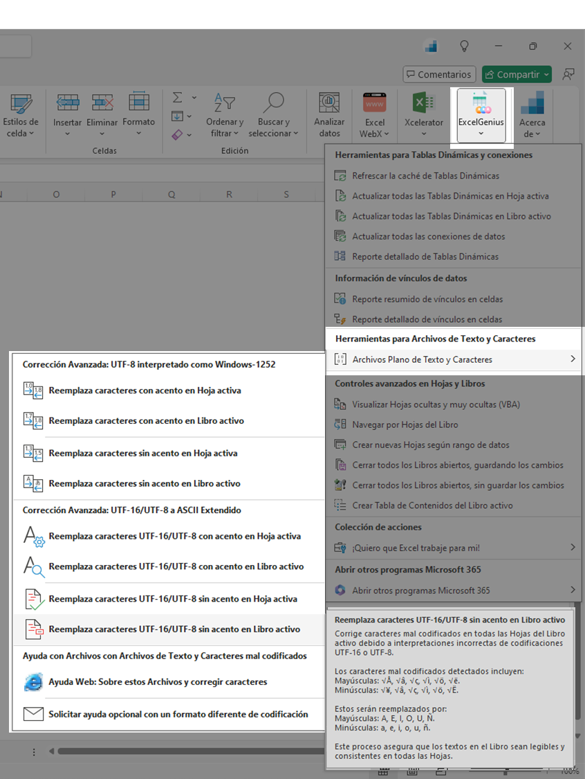 Si trabajas con archivos en Excel provenientes de diferentes fuentes, es común encontrarte con caracteres mal codificados como ñ, éo √Å, lo que puede ser frustrante. Estos problemas surgen por discrepancias en la codificación del archivo , y aunque parecen difíciles de solucionar, ¡no te preocupes! Con ExcelGenius Suite , puedes corregir estos errores de forma rápida y sencilla.